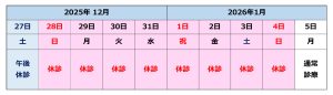 12月28日(日)~2026年1月4日(日)まで休診させていただきます。